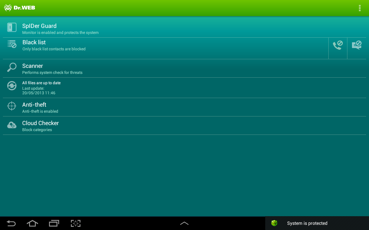 • Real-time file system scanning with SpIDer Guard monitor whenever attempts are made to save files to the device’s memory.